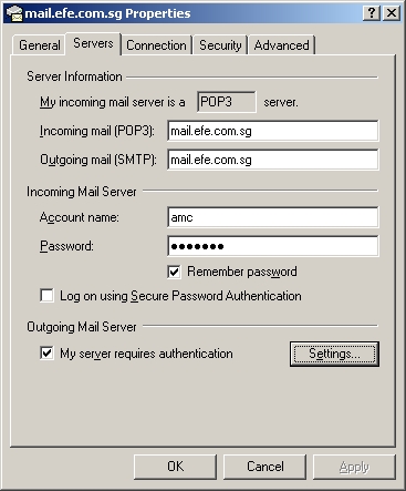 User Guide - Enable SMTP AuthenticationBy Moke (moke@amcpl.net) - 20051219SMTP Authentication allow mail server to authenticate and validate userBefore allowing the remote connection to sendmail from the office's server. This is to ensure that other people from the internet can't use your office bandwidth to send junk mail. To SMTP authentication ... 1. Launch Outlook Express 2. Goto --> Tools --> Account ![]() 3. Select your account --> Click Properties ![]() 4. Select [Servers] --> Tick on [My server requires authentication] ![]() 5. Click on [Setting] 6. Select [Use same settings as my incoming mail server] 7. Click on [OK] 8. Done 9. You should be able to send mail from remote connection now |