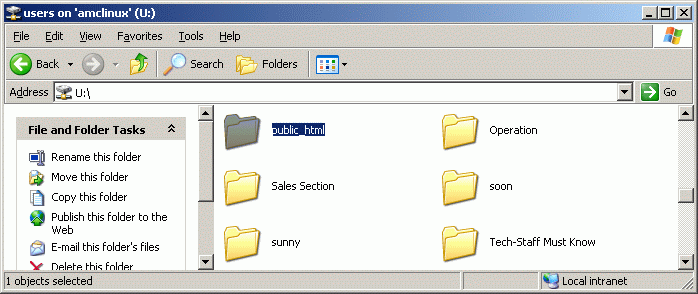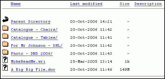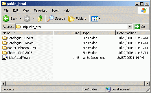User Guide - Allow download for big files from your serverBy Moke (moke@amcpl.net) - 20061122IntroductionThere are times that you need to :-All you need to do is, save it in U:\public_html, and give them the web-link to download the file. The link will usually be http://webmail.yourdomain.com/public_html/ This is what your contact see for download![]() You may even organise your product catalogues or download in the page from your server. You may even protect this page with a password to prevent unauthorise download. This is how you do it--> My Computer --> U Drive --> Locate a folder call public_html